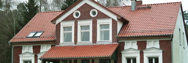 Wohnhaus mit Flachdachpfanne, schwarz engobiert, Dachkästen weiß lackiert.